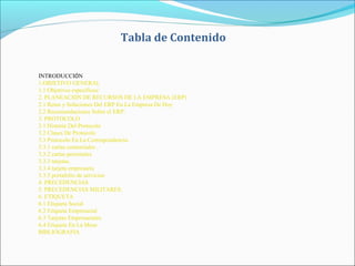 Este documento resume temas importantes como la planeación de recursos de la empresa (ERP), el protocolo, y la etiqueta. Explica que el ERP es un sistema integral que automatiza procesos en las diferentes áreas de una organización. También define el protocolo como las reglas para comportarse en diferentes situaciones, y la etiqueta como las costumbres para interactuar con los demás. Finalmente, brinda detalles sobre estas áreas y cómo aplicar conceptos de protocolo y etiqueta en correspondencia y eventos empresariales.