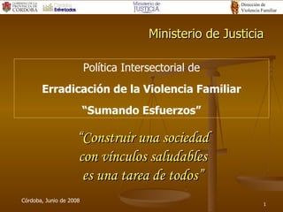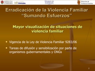 El documento presenta información sobre la política intersectorial de erradicación de la violencia familiar en Córdoba, Argentina. Reporta estadísticas sobre denuncias de violencia familiar en la provincia y perfiles de víctimas y agresores. También describe las acciones del plan integral para abordar la violencia familiar, incluyendo el registro de casos, capacitación, prevención y asistencia a través de una articulación intersectorial entre diferentes organismos gubernamentales y organizaciones.