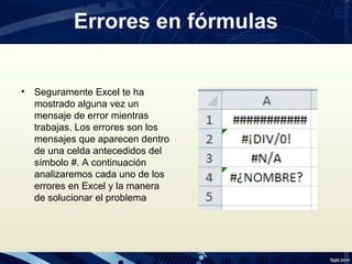 El documento describe los diferentes tipos de errores que pueden ocurrir al usar fórmulas en Excel. Explica que los errores aparecen dentro de una celda precedidos por el símbolo # y analiza cada tipo de error comenzando con #N/D, #DIV/0!, #NUM!, #VALUE!. Luego continúa explicando el error #VALUE! que ocurre cuando se usan argumentos de texto en lugar de valores numéricos como espera la función. El documento concluye con una bibliografía de dos enlaces sobre errores en fórmulas de Excel.