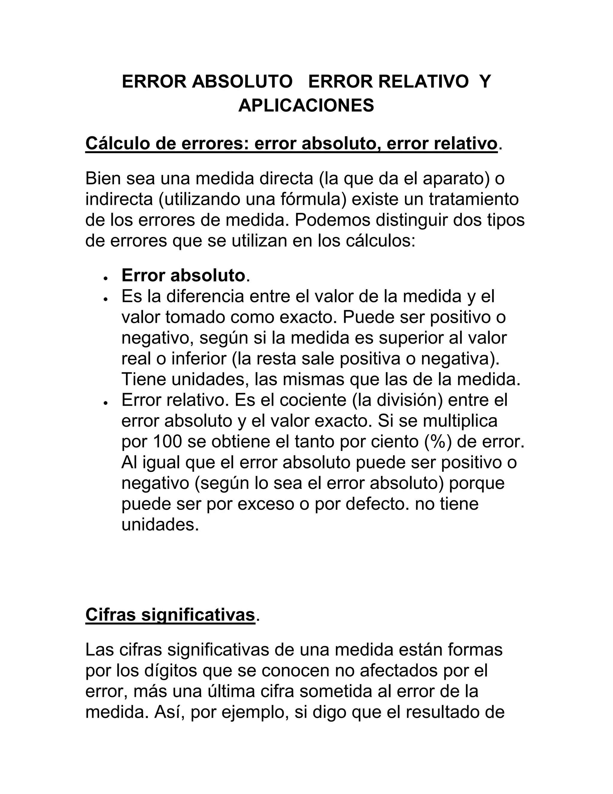 El documento describe dos tipos de errores en mediciones: error absoluto y error relativo. El error absoluto es la diferencia entre el valor medido y el valor real, mientras que el error relativo es el error absoluto dividido por el valor real expresado como porcentaje. También discute el número de cifras significativas en mediciones y la importancia de realizar múltiples mediciones para calcular la media y los errores.