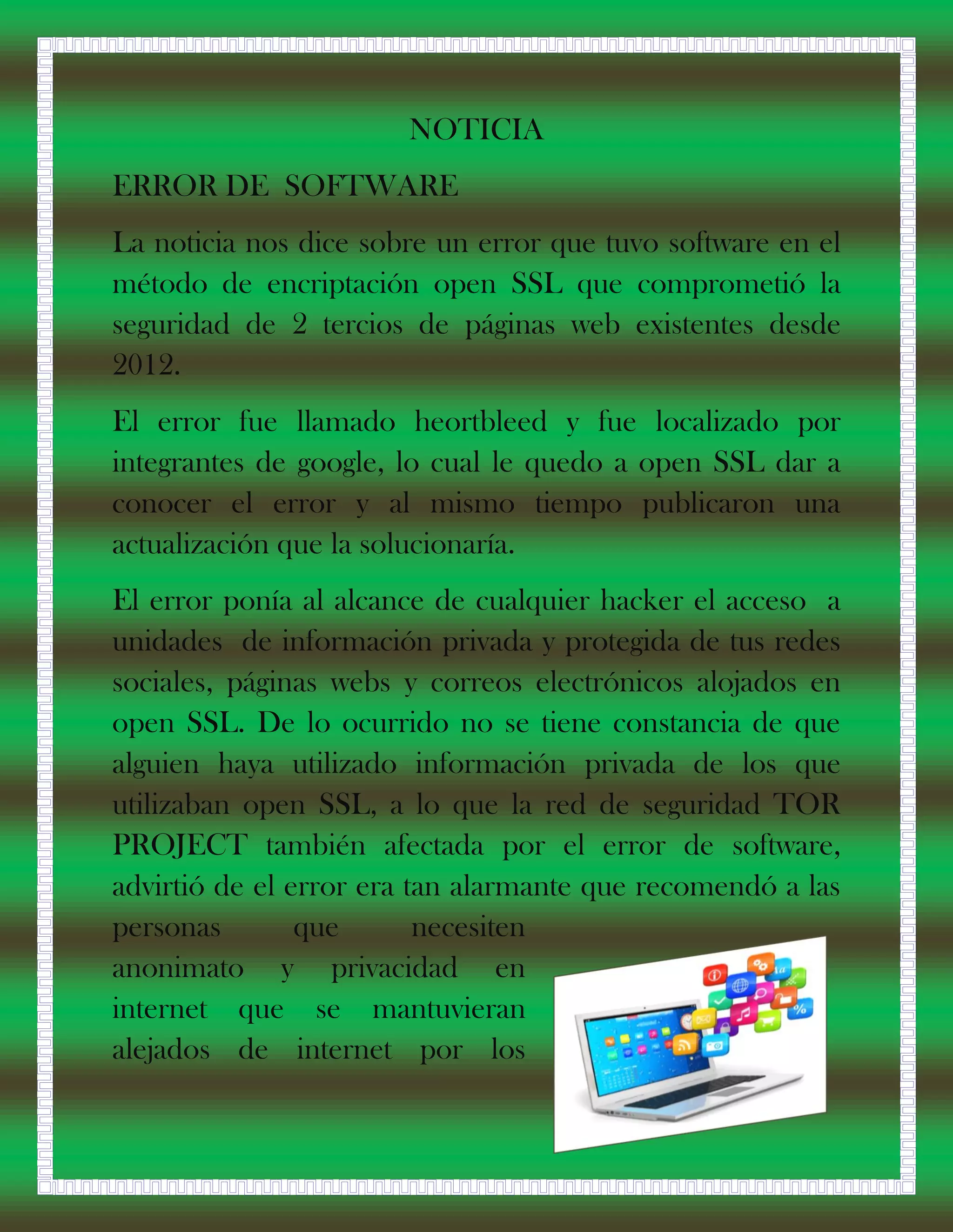 Un error de software en el método de encriptación OpenSSL comprometió la seguridad de dos tercios de las páginas web existentes desde 2012, exponiendo información privada de usuarios. El error, llamado Heartbleed, fue descubierto por integrantes de Google y reportado a OpenSSL, que publicó una actualización para solucionarlo. Aunque no hay constancia de que alguien haya accedido información privada, la red Tor advirtió que el error era tan grave que recomendó evitar internet por unos días.