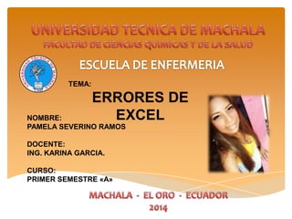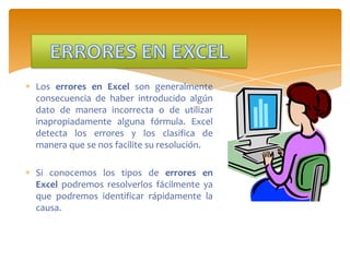 El documento habla sobre los diferentes tipos de errores que puede mostrar Excel y cómo resolverlos. Describe errores como #NOMBRE (cuando se usa una función inexistente), #¡REF! (cuando una celda hace referencia a una celda eliminada), #¡DIV/0! (cuando se divide entre cero), #¡VALOR! (cuando se usan datos incorrectos en una función), #¡NUM! (cuando una operación sobrepasa los límites de Excel) y #N/A (cuando una función de búsqueda no encuentra el valor buscado). El documento