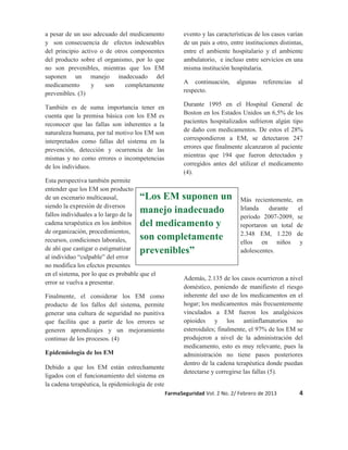 Los errores de medicación (EM) son incidentes prevenibles que ocurren en cualquier etapa de la cadena terapéutica y pueden causar daño al paciente. Los EM son producto de fallas sistémicas y no de errores individuales. Se estima que los EM ocurren en el 6.5-7% de pacientes hospitalizados y son responsables de muertes anuales. Los EM tienen costos económicos significativos para los sistemas de salud. Considerar los EM como fallas sistémicas permite generar aprendizajes para mejorar procesos y prevenir