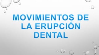 Este documento describe el proceso de erupción dental, incluyendo las erupciones temporales y permanentes. Se divide la erupción dental en tres fases: preeruptiva, eruptiva prefuncional y eruptiva funcional. También se enumeran factores que pueden acelerar o retrasar la erupción dental y los síntomas comunes que ocurren durante el proceso de erupción.