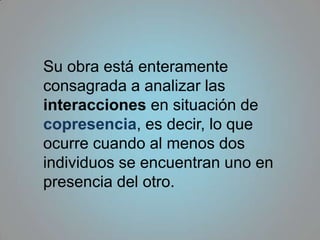 Erving Goffman fue un sociólogo y psicólogo canadiense cuyo trabajo analizó las interacciones humanas y cómo los individuos representan roles sociales. En su obra más famosa, La presentación de sí mismo en la vida cotidiana, Goffman argumenta que las personas actúan roles sociales como si estuvieran en el escenario, usando máscaras e idealizaciones para influir la impresión que causan en los demás. Utilizando un enfoque etnometodológico, Goffman examinó cómo los individuos cooperan para definir situaciones social
