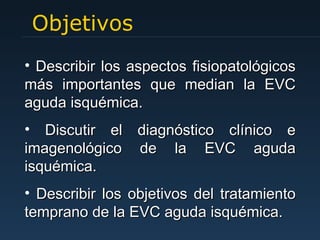 El documento describe el caso clínico de una mujer de 49 años que presenta disartria, cefalea y debilidad en el lado derecho de su cuerpo. Tras realizar exámenes físicos y neurológicos, se determina que la paciente probablemente sufrió un infarto cerebral en el hemisferio izquierdo del cerebro. El documento luego procede a discutir aspectos fisiopatológicos, clasificaciones, diagnóstico clínico e imagenológico del infarto cerebral agudo isquémico.