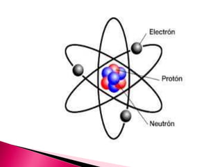 Este documento describe la estructura fundamental de la materia. Explica que los átomos son las partículas más pequeñas que forman todas las sustancias y que dentro de cada átomo hay partículas aún más pequeñas llamadas protones, neutrones y electrones. Los protones y neutrones se encuentran en el núcleo del átomo, mientras que los electrones giran alrededor del núcleo. Los átomos se unen para formar moléculas mediante el compartir de electrones, y grandes cantidades de los mismos átomos forman