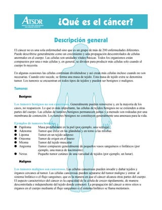 El cáncer es un grupo de más de 200 enfermedades caracterizadas por el crecimiento y propagación anormal e incontrolada de células. Los tumores pueden ser benignos o malignos (cancerosos). Los tumores malignos invaden y dañan tejidos cercanos y pueden propagarse a otras partes del cuerpo a través del sistema linfático o sanguíneo. Algunas causas de cáncer incluyen sustancias químicas, tabaco, radiación, factores hereditarios y desconocidos. La detección temprana a través de
