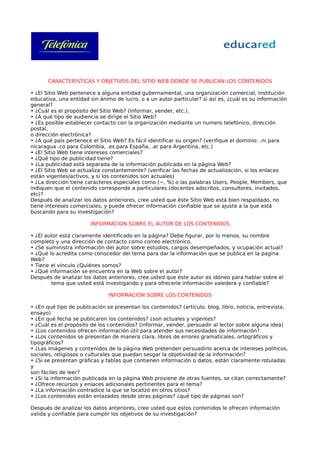 El documento proporciona una lista de preguntas para evaluar la confiabilidad de un sitio web, incluyendo si pertenece a una entidad gubernamental u otra organización, su propósito y audiencia, contacto, origen, intereses comerciales, actualizaciones, y si la información parece confiable. También incluye preguntas para evaluar la idoneidad del autor y la calidad y actualidad de los contenidos.