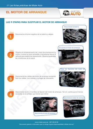 El documento proporciona instrucciones para diagnosticar y reemplazar un motor de arranque defectuoso. Explica que un motor de arranque eléctrico permite encender el motor de combustión interna y que si el auto tiene dificultades para arrancar, puede deberse a una batería descargada o a un problema en el motor de arranque. Detalla nueve pasos para reemplazar el motor de arranque, que incluyen desconectar la batería, aflojar los tornillos de sujeción, retirar el motor usado e instalar el