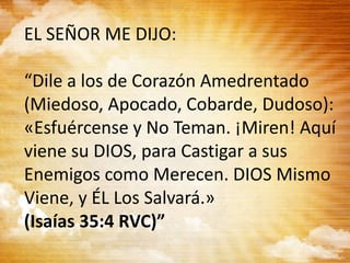 El documento relata un mensaje de aliento del Señor a Josué después de la muerte de Moisés, instándole a ser valiente y esforzarse en liderar al pueblo hacia la tierra prometida. Se enfatiza la importancia de seguir las leyes de Dios y meditar en su palabra para lograr el éxito y la prosperidad. La conclusión destaca el inicio de una nueva etapa de valentía y determinación, sin desánimo ni retrocesos.