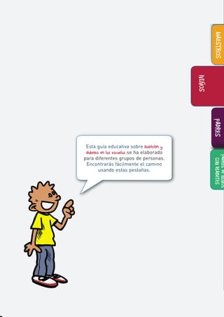 Esta guía educativa sobre nutrición y diabetes en las escuelas se ha desarrollado para informar a padres y maestros sobre la importancia de la nutrición en el manejo de la diabetes tipo 2 en niños. Proporciona herramientas y estrategias para fomentar hábitos alimenticios saludables y guiar a los estudiantes con diabetes en el control de sus niveles de glucosa en sangre. Además, incluye recomendaciones para planificar comidas saludables y promover un entorno escolar que apoye el bienestar nutricional.