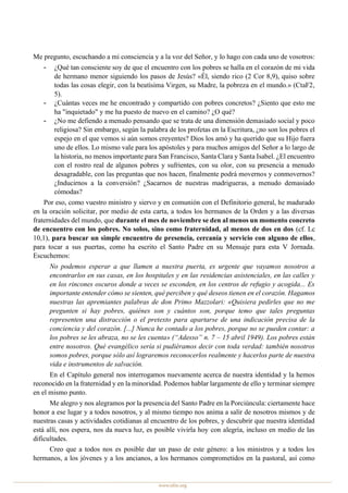 El Ministro General de la Orden de Hermanos Menores envía una carta a los frailes instándolos a encontrar a los pobres durante el mes de noviembre. Señala que el Papa Francisco visitará la Porciúncula el 12 de noviembre para encontrarse con 500 pobres, y pide a los frailes que también salgan a encontrar a los pobres de dos en dos, para escucharlos y servirlos. Argumenta que el encuentro con los pobres está en el corazón de su vocación franciscana de seguir los pasos de Jesús, y que este encuentro