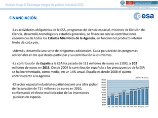 Este documento describe la financiación de la Agencia Espacial Europea (ESA) por parte de España. Las actividades obligatorias de la ESA se financian en función del PIB de cada país miembro. España puede participar también en programas adicionales optativos y ha incrementado su contribución a la ESA de 111 millones de euros en 2000 a 202 millones en 2011, con un aumento medio anual del 14% desde 2004. La industria espacial española facturó 711 millones de euros en 2010, demostrando el efecto multiplicador de las inversiones públicas en el