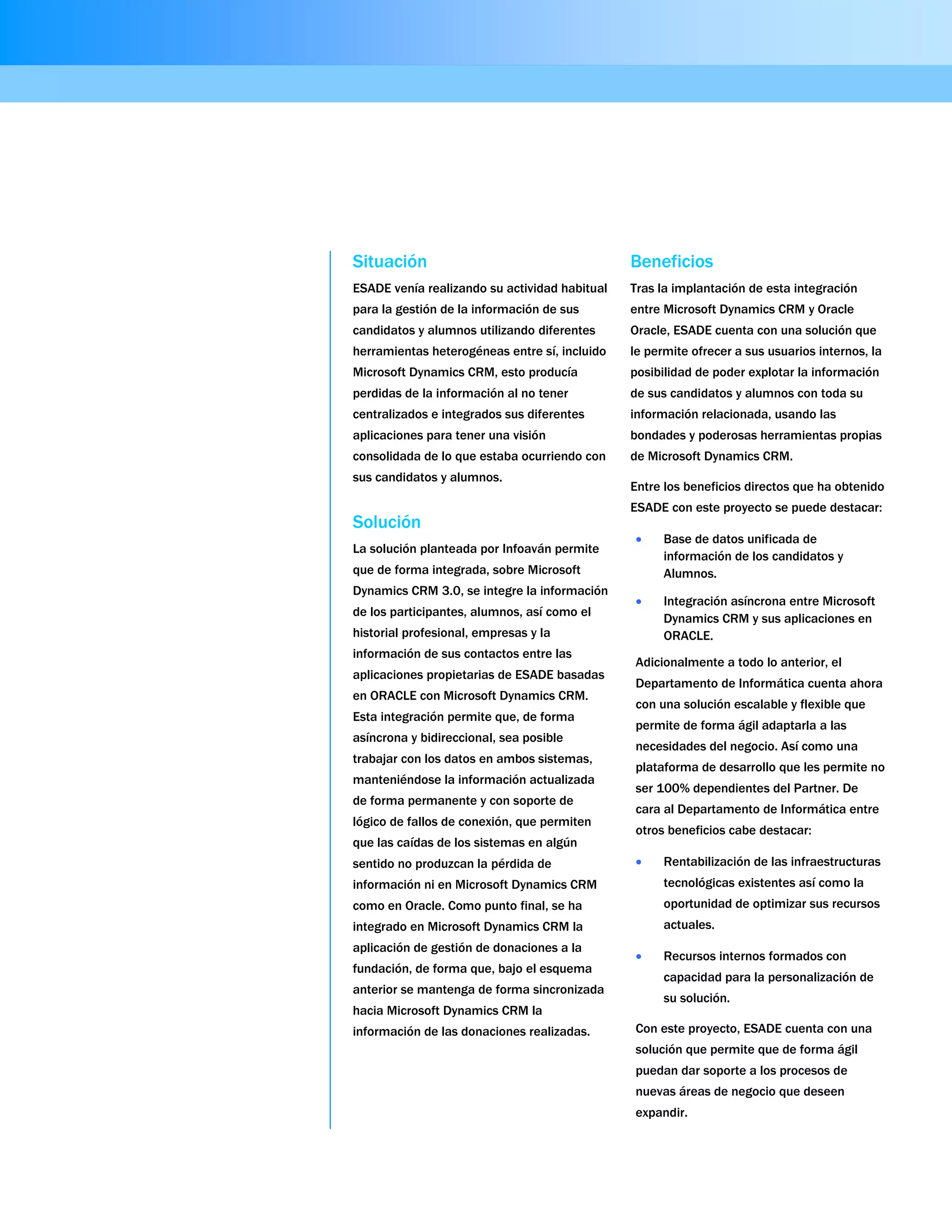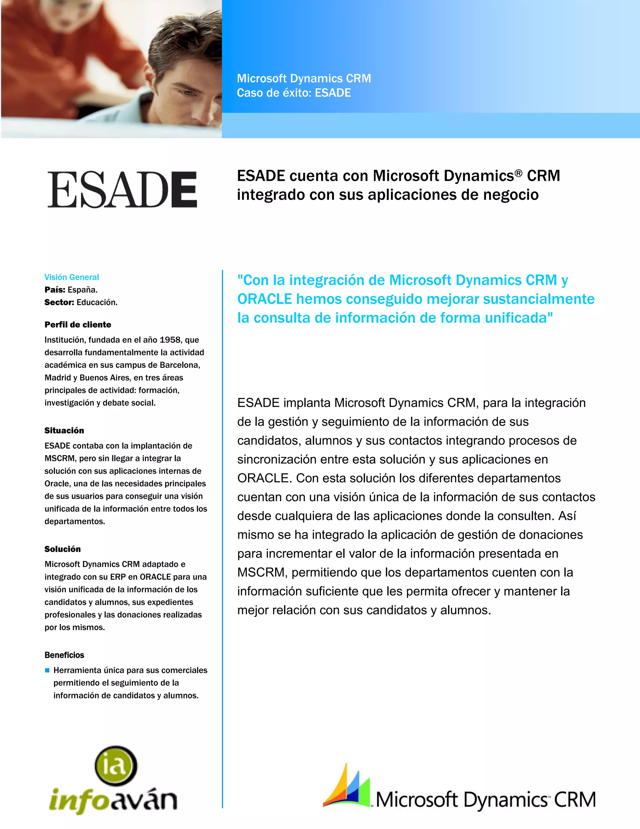 ESADE implementó Microsoft Dynamics CRM para integrar la gestión y seguimiento de información de candidatos, alumnos y contactos. Esto incluyó procesos de sincronización entre Dynamics CRM y aplicaciones de Oracle, permitiendo a departamentos acceder a información unificada de contactos. También se integró una aplicación de gestión de donaciones para mejorar el valor de información en Dynamics CRM. Esto permite a departamentos mantener mejores relaciones con candidatos y alumnos usando las herramientas de Dynamics CRM.