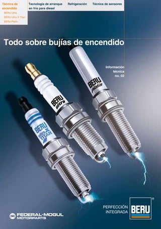Este documento proporciona información sobre bujías de encendido. Brevemente describe: 1) los requisitos que deben cumplir las bujías modernas como generar chispas potentes, resistir altas temperaturas y presiones, y soportar descargas eléctricas; 2) la estructura básica de una bujía, incluyendo el electrodo central, electrodos de masa, y distancia entre electrodos; y 3) los materiales y diseños disponibles como electrodos de platino o titanio que prolongan los intervalos de cambio.