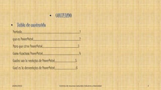 PowerPoint es un programa de Microsoft que permite crear presentaciones visuales con diapositivas que incluyen texto, imágenes y videos. Se usa comúnmente para presentaciones educativas o comerciales. El documento explica las funciones básicas de PowerPoint, como agregar y animar elementos en las diapositivas, y menciona algunas ventajas y desventajas de usar presentaciones de PowerPoint.