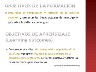 Este documento describe un curso de actualización y perfeccionamiento para profesores de español como lengua extranjera. El curso se centra en ayudar a los profesores a mejorar su práctica docente a través del desarrollo de un portafolio que incluye módulos sobre fundamentos curriculares, didáctica de componentes, metodología y TIC, supervisado por un monitor.