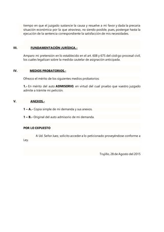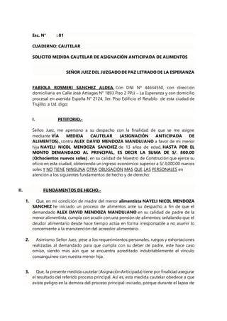 El documento presenta solicitudes de medidas cautelares de asignación anticipada de alimentos de diferentes madres hacia los padres de sus hijos menores, argumentando la irresponsabilidad en el cumplimiento de sus deberes alimentarios. Cada petición incluye fundamentos de hecho y de derecho, destacando la necesidad urgente de apoyo económico debido a situaciones precarias de las solicitantes. Se hacen referencia a normativas legales que respaldan dichas solicitudes y se adjuntan documentos probatorios que sustentan los reclamos.