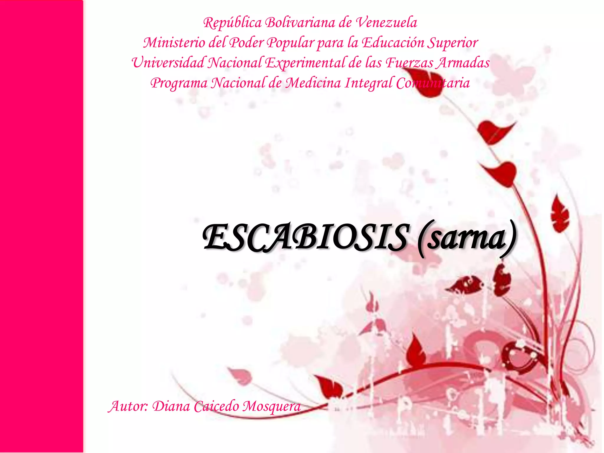 La escabiosis o sarna es causada por el ácaro Sarcoptes Scabiei. Afecta a 300 millones de personas anualmente y se transmite por contacto directo con una persona infectada. Los síntomas incluyen intenso prurito nocturno y lesiones cutáneas, especialmente en las manos, pies y genitales. El diagnóstico se realiza clínicamente o mediante pruebas microscópicas. El tratamiento de elección son pomadas de permetrina, lindano o azufre aplicadas toda la piel. Es importante tr