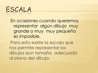La escala representa objetos a diferentes tamaños cuando su tamaño real no cabe en el plano o dibujo. Se define como la relación entre las medidas del dibujo y la realidad, representada como una fracción donde cuanto más pequeño sea el numerador, más pequeña será la escala. La escala debe indicarse siempre en el dibujo técnico para mostrar claramente las dimensiones reales.