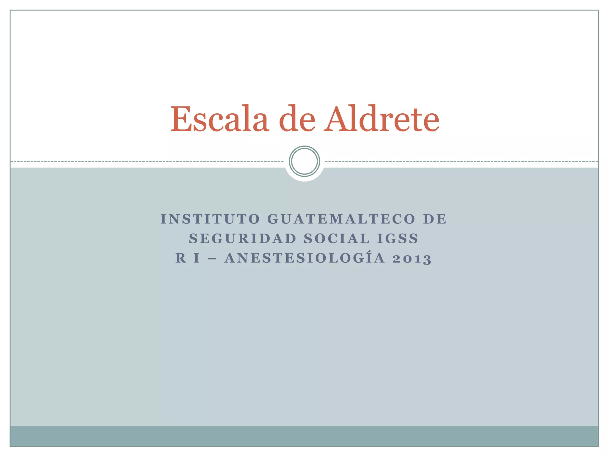 El documento proporciona información sobre la escala de Aldrete para evaluar la recuperación de pacientes después de la anestesia. Explica que el Dr. Antonio Aldrete desarrolló una escala en 1970 para medir objetivamente el progreso de la recuperación de la anestesia usando 5 categorías: actividad, respiración, circulación, conciencia y saturación de oxígeno. La escala de Aldrete se utiliza ampliamente hoy para determinar cuándo es seguro que un paciente sea dado de alta de la unidad de cuidados posan