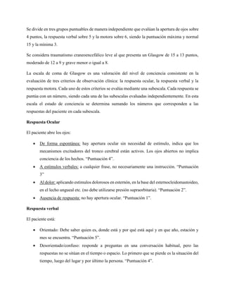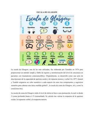 La escala de Glasgow es una herramienta utilizada para evaluar el nivel de conciencia de pacientes con traumatismo craneoencefálico. Se compone de tres subescalas que evalúan la respuesta ocular, verbal y motora, asignando puntos de 1 a 6 en cada una. La puntuación total va de 3 a 15 puntos, y determina si el traumatismo es leve, moderado o grave.
