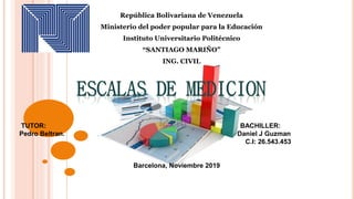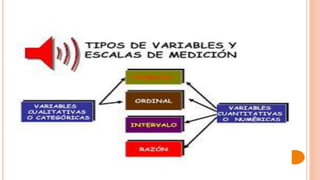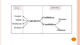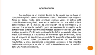 El documento describe los diferentes tipos de escalas de medición, incluyendo escalas nominales, ordinales, de intervalo y de razón. Explica las propiedades de cada escala y los ejemplos de variables que se pueden medir con cada una. También destaca la importancia de las escalas de medición en la investigación científica para clasificar variables y seleccionar los métodos estadísticos apropiados.