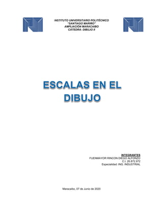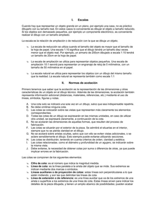 Este documento describe diferentes técnicas de dibujo técnico como escalas, acotación, perspectiva y proyección. Explica que la escala es la relación de ampliación o reducción para dibujar un objeto, y que la acotación representa dimensiones y características mediante líneas y símbolos. También describe cómo la perspectiva recrea la profundidad de objetos en un plano, y que la proyección representa objetos mediante haces de líneas desde un punto de vista hasta un plano.