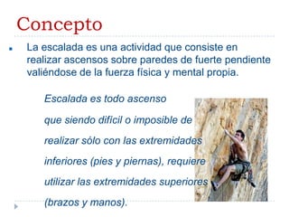 La escalada consiste en ascender paredes rocosas o artificiales utilizando las extremidades superiores e inferiores. Existen varias modalidades como la libre, deportiva o en rocódromos. Se requiere equipo especializado como arnés, cuerdas y mosquetones para asegurar al escalador. La técnica básica implica mantener tres puntos de apoyo y desplazarlos de forma segura y controlada.