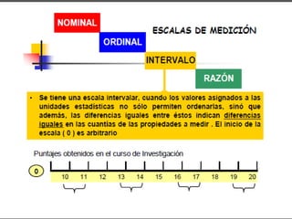 Este documento describe las diferentes escalas de medición utilizadas para medir variables o atributos, incluyendo escalas nominales, ordinales, de intervalo y de razón. Las escalas nominales y ordinales son escalas categóricas utilizadas para variables cualitativas, mientras que las escalas de intervalo y de razón son escalas numéricas adecuadas para variables cuantitativas. Es importante entender los diferentes tipos de escalas de medición para seleccionar las técnicas estadísticas apropiadas y evitar errores en el análisis de datos