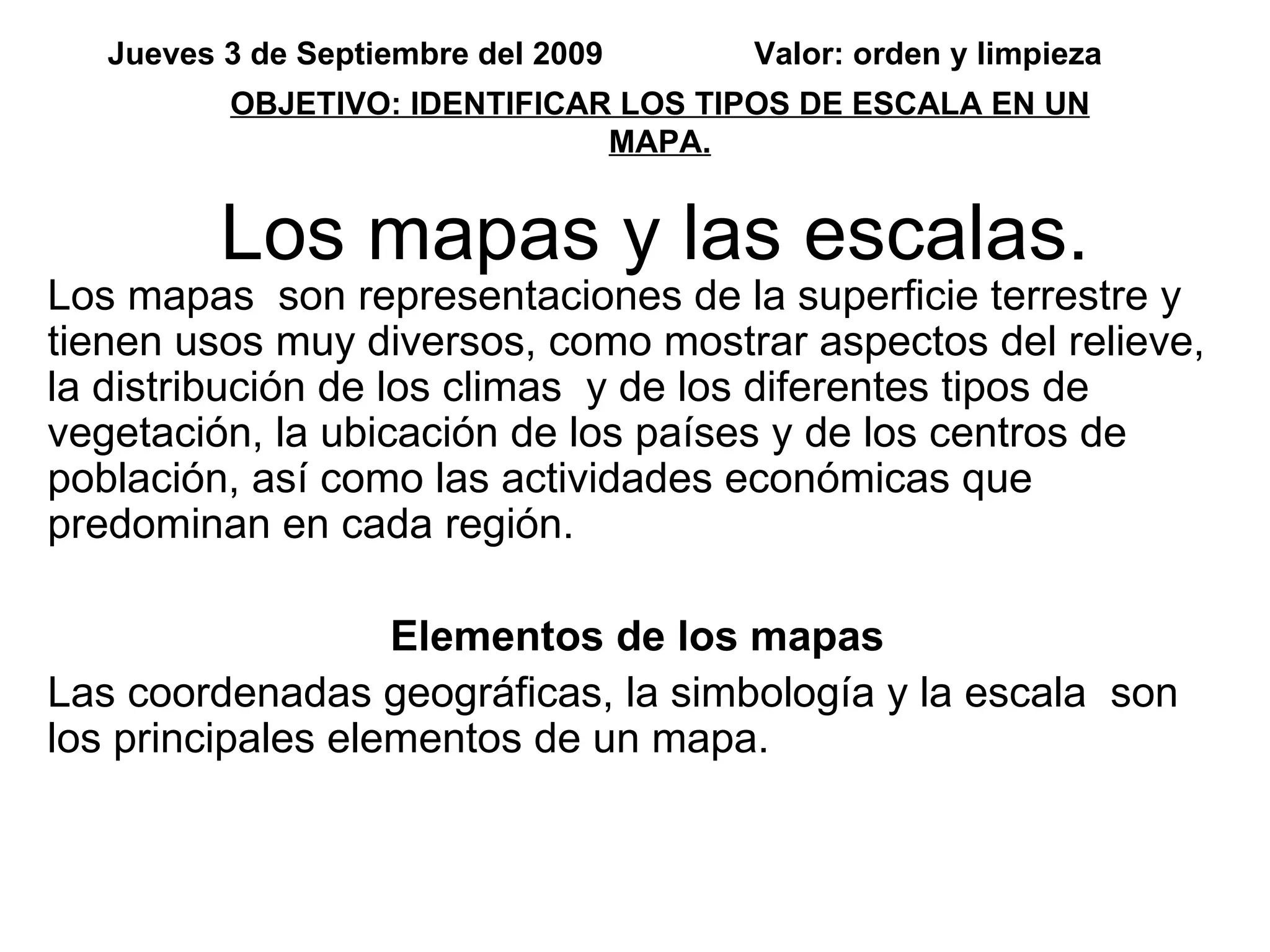 Este documento describe los mapas y sus elementos, incluyendo la escala. Explica que la escala sirve para calcular el tamaño real y las distancias representadas en un mapa. Luego identifica los dos tipos principales de escala: la escala numérica, que expresa la relación entre la unidad de medida del mapa y la distancia real; y la escala gráfica, que permite medir distancias directamente en el mapa usando una regla. El objetivo es identificar los tipos de escala en un mapa.
