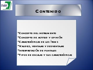 Este documento describe diferentes tipos de escalas utilizadas para medir actitudes u opiniones, incluyendo escalas de ordenación, escalas valorativas sumatorias, escalas de intensidad, escalas de distancia social, escalas de Likert y el diferencial semántico. Explica las características de cada escala y cómo interpretar los resultados.