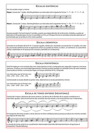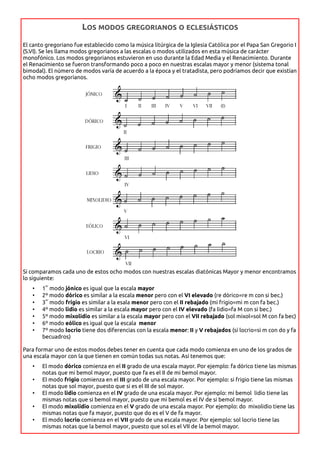 El documento describe los diferentes tipos de escalas musicales, incluyendo los 8 modos gregorianos, las escalas mayor y menor, la escala cromática, las escalas pentatónicas y la escala de tonos enteros. Proporciona ejemplos de cada escala y ejercicios para practicar su construcción y reconocimiento.