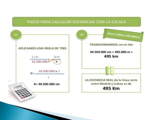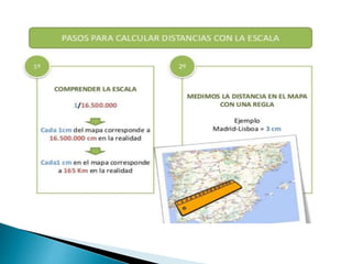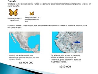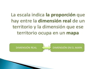 Las escalas son proporciones que indican la relación entre las distancias reales y las representadas en un mapa u otro documento geográfico. Existen escalas numéricas y gráficas. Las escalas numéricas más pequeñas como 1:1,000,000 muestran información general, mientras que escalas más grandes como 1:50,000 proveen detalles. Los mapas, planos, atlas y otros recursos utilizan escalas para representar la Tierra.