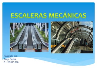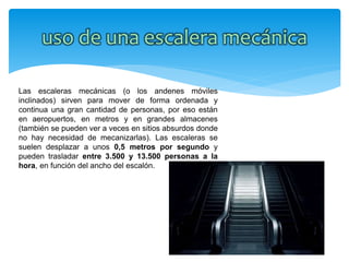 El documento describe las partes principales de una escalera mecánica, incluyendo los peldaños, la caja estructural, las unidades motrices, las cadenas y ruedas dentadas que impulsan el movimiento, y los pasamanos móviles. Explica que las escaleras mecánicas se usan para transportar grandes cantidades de personas de forma ordenada y continua en lugares como aeropuertos y estaciones de metro, moviendo los peldaños a una velocidad de aproximadamente 0.5 metros por segundo.