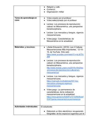 El documento describe una lección sobre las características de la civilización mesoamericana que aún permanecen en la actualidad. El objetivo es que los estudiantes comprendan la relación entre el pasado y el presente en México y valoren las formas de vida de los pueblos indígenas. Los estudiantes completarán tareas como crear un libro electrónico sobre elementos mesoamericanos en su entorno y visitar lugares para identificar dichos elementos.