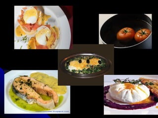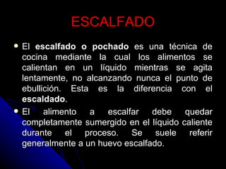 El documento describe dos métodos de cocción: el escalfado, en el que los alimentos se calientan lentamente en un líquido sin alcanzar el punto de ebullición, y el huevo escalfado como ejemplo, en el que se sumerge un huevo en agua muy caliente con vinagre para mantener la clara blanca.