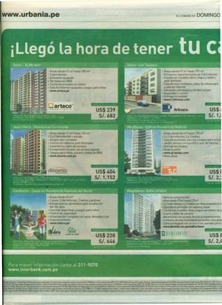 El documento presenta anuncios de diferentes proyectos inmobiliarios ubicados principalmente en Miraflores, Lima. Se describen características como el tamaño de las unidades (desde 57m2 hasta 229m2), cantidad de dormitorios y baños, acabados, ubicación y contacto para más información. Los proyectos incluyen departamentos, casas, locales comerciales y terrenos.