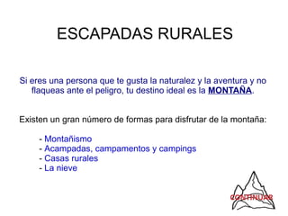 Este documento describe varias actividades de ocio al aire libre que se pueden realizar en la montaña o en zonas rurales. Se mencionan actividades como el senderismo, el ciclismo de montaña, la escalada, acampar en tiendas o autocaravanas, alojarse en casas rurales o albergues, y practicar deportes de invierno como el esquí o el snowboard. También habla de opciones para alojamiento como hoteles a pie de pista o cabañas para practicar deportes de invierno.
