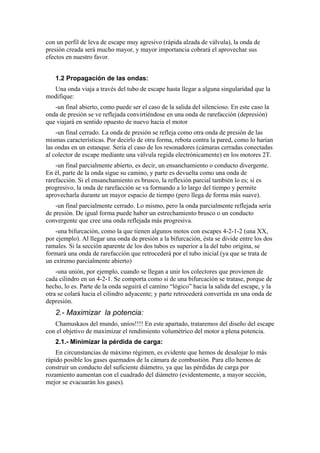 El documento describe el sistema de escape de un motor. Explica que cuando se abre la válvula de escape, se crea una onda de presión que viaja a través del sistema de escape. La longitud y diseño del sistema afectan cuándo y cómo llegan estas ondas de presión, lo que puede mejorar o empeorar el rendimiento del motor. También analiza cómo las ondas de presión interactúan de manera diferente en motores de 4 y 2 tiempos, y cómo el diseño del sistema de escape puede optimizarse para diferentes regímenes del motor.