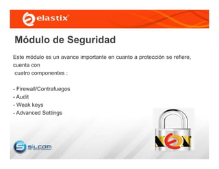 Este módulo describe la seguridad en Elastix, incluyendo cuatro componentes principales: firewall, auditoría, detección de contraseñas débiles y opciones avanzadas. Proporciona configuración de puertos y servicios a través de reglas iptables. Ofrece registro de accesos y navegación de usuarios así como filtros de información. Controla las contraseñas débiles y permite cambiar la contraseña de Freepbx de manera segura.