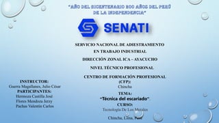Este documento proporciona información sobre la técnica del escariado. Explica que un escariado es una herramienta rotativa utilizada para agrandar agujeros a dimensiones precisas. Describe los diferentes tipos de escariadores, incluidos los manuales y de máquina, y sus partes. Además, detalla los pasos para escariar un agujero, como elegir el escariador adecuado, taladrar primero el agujero, aplicar lubricante y usar una llave para escariar. El documento concluye resumiendo que el