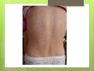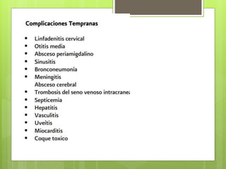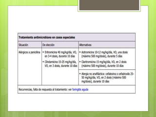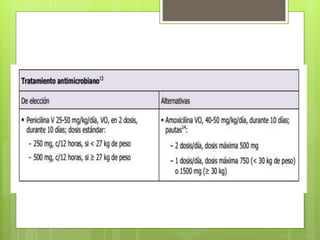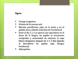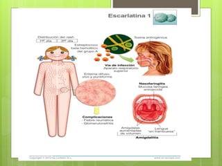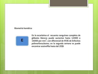La escarlatina es una enfermedad causada por una infección de garganta por el estreptococo del grupo A. Los síntomas incluyen fiebre alta, dolor de garganta y un exantema rojizo que se acentúa en pliegues de la piel. El diagnóstico se realiza mediante cultivo de exudado faríngeo o prueba rápida de antígenos. El tratamiento consiste en antibióticos como penicilina o cefalosporinas durante al menos 10 días para eliminar la bacteria.