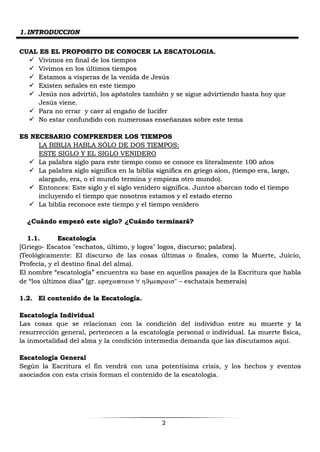 Este documento discute la escatología, o las enseñanzas bíblicas sobre los eventos finales. Explica que la escatología incluye tanto lo individual (la muerte, estado intermedio) como lo general (eventos asociados con el fin de los tiempos). Describe que después de la muerte, los creyentes van a la presencia del Señor hasta la resurrección, mientras que los no creyentes van al infierno. Finalmente, discute las posiciones católicas sobre el purgatorio y limbo, y la futura resurrección de los c
