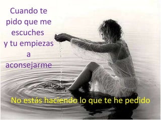 El documento expresa la necesidad de ser escuchado sin recibir consejos o soluciones a los problemas personales. El autor enfatiza que aceptar y validar los sentimientos es crucial para el bienestar emocional. La petición es simple: ser escuchado y reconocido sin juicios ni intentos de resolver la situación.