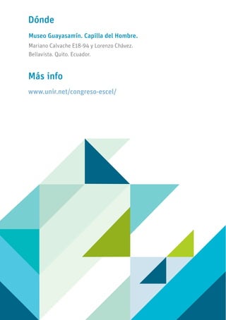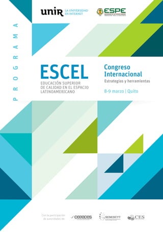 El documento presenta el programa del Congreso ESCEL sobre la colaboración universitaria entre España y América Latina, que se llevará a cabo los días 8 y 9 de marzo. Incluye la agenda con las conferencias, sesiones y mesas redondas sobre temas como los consorcios universitarios, estrategias tecnológicas para la enseñanza, la mejora de la calidad académica, y los programas de doctorado. También presenta una lista de los participantes en el congreso.