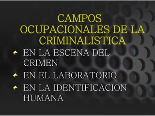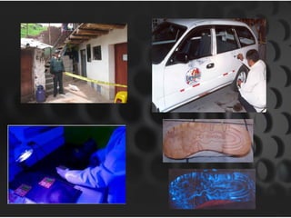 Este documento describe la criminalística como una ciencia multidisciplinaria que estudia las evidencias encontradas en la escena del crimen. Explica los campos de la criminalística como la inspección en la escena del crimen, laboratorio e identificación humana. También define conceptos como indicios, evidencias, tipos de escenas del crimen y los principios científicos de la criminalística para el análisis forense.