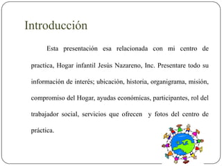 Este documento presenta información sobre el Hogar Infantil Jesús Nazareno, Inc. El hogar se ubica en Isabela, Puerto Rico y provee servicios como vivienda segura, alimentación balanceada, apoyo emocional y educación a niños entre 0-8 años que han sido removidos de sus hogares. El hogar fue fundado en 1987 y su misión es proveer un ambiente seguro y lleno de amor para que los niños puedan sanar y desarrollarse positivamente. La trabajadora social juega un rol importante al evaluar a los niños