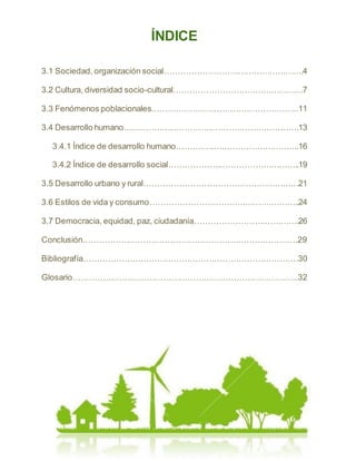 Este documento presenta información sobre el escenario socio-cultural y el desarrollo sustentable. Explica conceptos como sociedad, organización social, clases sociales, cultura y diversidad sociocultural. Describe cómo las sociedades modernas se organizan a través de estructuras como el Estado, la economía y el sistema político. También analiza conceptos como desarrollo humano, índices de desarrollo humano e índices de desarrollo social. El documento provee una introducción a estos temas en el contexto del desarrollo sustent